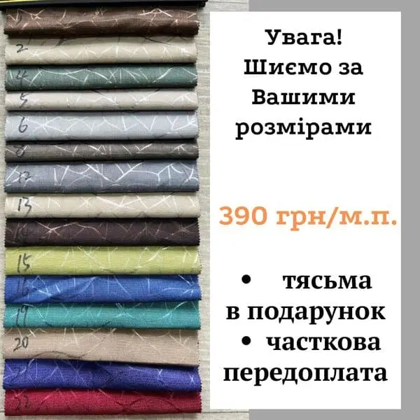 Ми пропонуємо готові штори 1,5м + 1,5м. висота 2.7м. Якщо Вам потрібно зменшити висоту - наші майстри з радістю допоможуть.